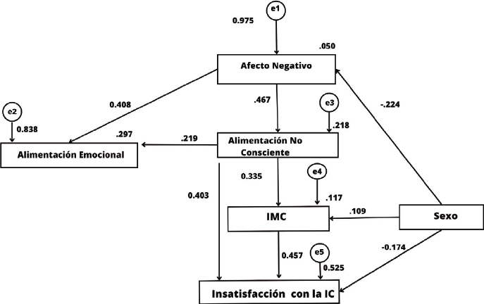 En este modelo, representado en la Figura 1, el afecto negativo (Afecto negativo) influye de manera directa sobre la alimentación emocional (β=.408) y alimentación no consciente (Alimentación No consciente) (β=.467); la alimentación no consciente influye sobre el IMC (β=.335) y sobre la insatisfacción corporal (β=.403), mientras que el IMC influye sobre la insatisfacción corporal (β=.457). En este modelo llama la atención el efecto con signo negativo (β=-.224) del sexo sobre el afecto negativo y sobre la insatisfacción con la imagen corporal (β =-.174) indicando que si el sexo del participante es mujer el problema en dichas variables se incrementa, por otro lado, también se observa un efecto positivo del sexo sobre el IMC, indicando que si el sexo es hombre este último se incrementa (β=.109). En este sentido, en la misma Figura 1, se pueden observar direcciones con signo positivo del afecto negativo sobre la alimentación emocional (Alimentación emocional) y la alimentación sin consciencia, de ésta sobre IMC, insatisfacción con la IMC y alimentación emocional, indicando en todos los casos que si la variable exógena aumenta, la variable endógena también lo hace. Es importante mencionar que el 29.7% (R2=.297) de la variabilidad en la alimentación emocional y el 21.8% (R2=.218) de la variación en la alimentación no consciente es explicado por el afecto negativo; el 11.7% (R2=.117) de la variabilidad en el IMC es explicado por la alimentación no consciente y el sexo; finalmente el 52.5% (R2=.525) de la variación en la insatisfacción corporal es explicado por el IMC, la alimentación no consciente y el sexo del participante.