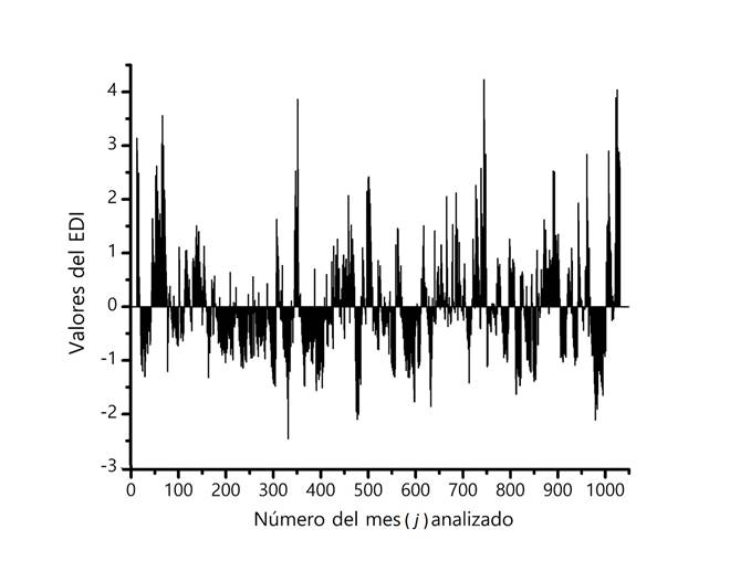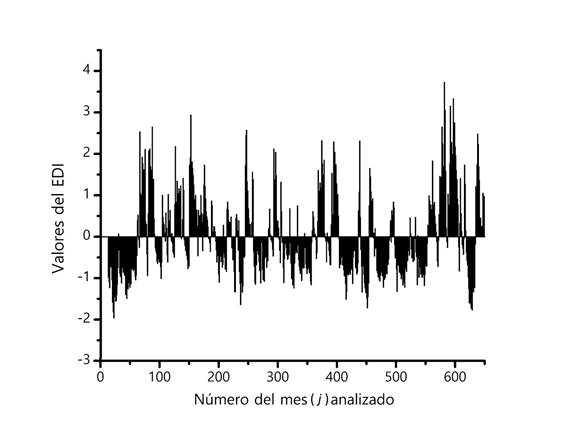La gráfica del EDI mostrada en la Figura 1 tiene una gran similitud con la citada del SPI. En ella también se observa que una sequía importante por su duración y severidad fue la primera del registro. Tal sequía llegó al mes 61, es decir, a enero de 1966, con su mínimo de -1.96 en octubre de 1962 (j = 22).
