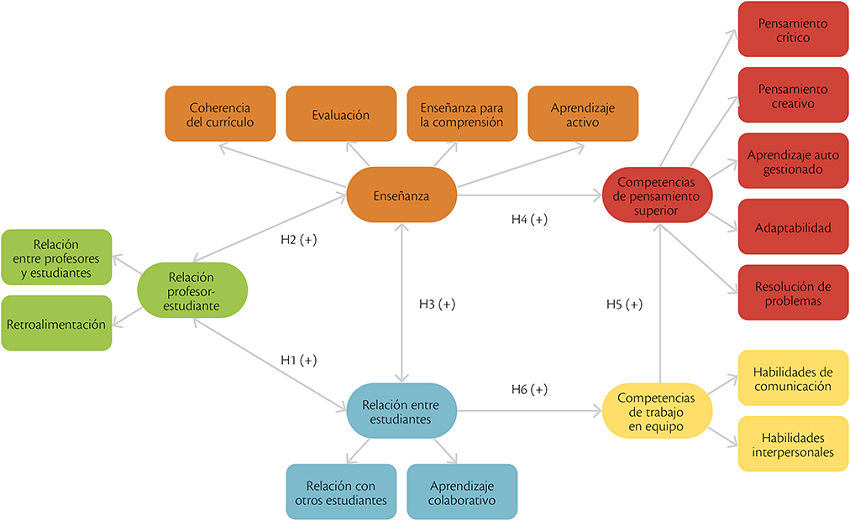 Por último, la relevancia de la relación entre pares en el proceso de aprendizaje ha sido reportada a nivel universitario (Bowden et al., 2021). Kember y Leung (2009), señalaron que la relación entre estudiantes influye positivamente sobre el desarrollo de competencias de trabajo en equipo a nivel de pregrado, lo cual se ha validado en otros contextos (Gargallo et al., 2018). Por lo que se sugiere la siguiente hipótesis: