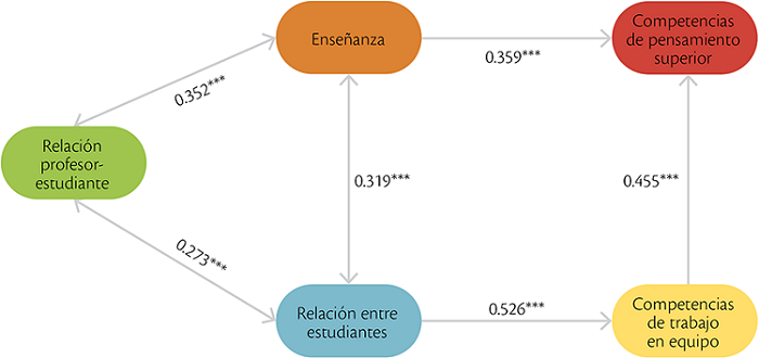 | Competencias de trabajo en equipo | <- | Relación estudiante-estudiante | 0.526*** | 0.084 |