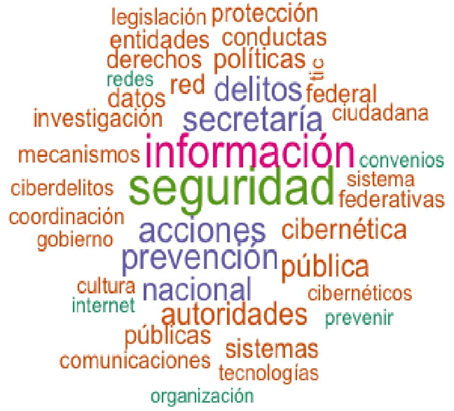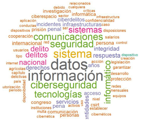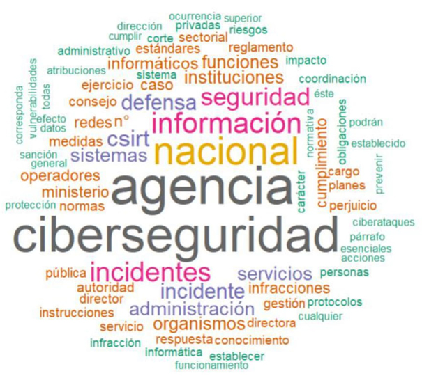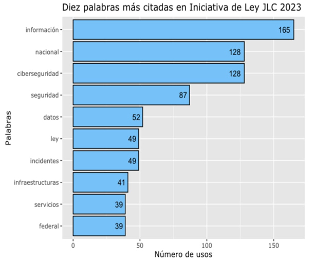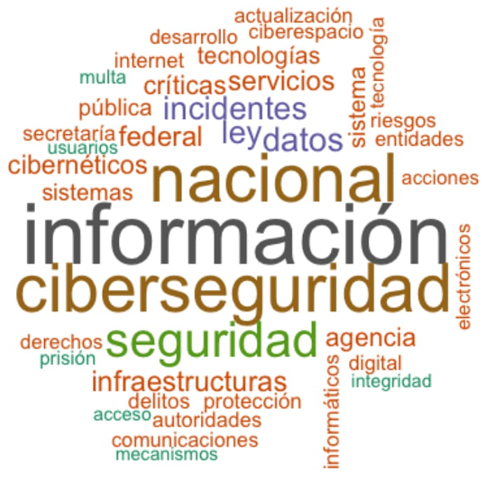 En el análisis de las palabras más citadas se encontraron “información” con 165 repeticiones, “nacional” (128), “ciberseguridad” (128), “seguridad” (87) y “datos” (52). De nueva cuenta, el análisis presenta que el enfoque de la ley es estado-céntrico, con una visión que prioriza a la política de ciberseguridad con un enfoque en seguridad nacional.