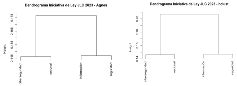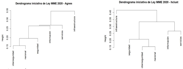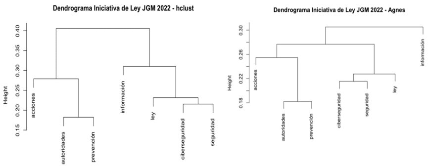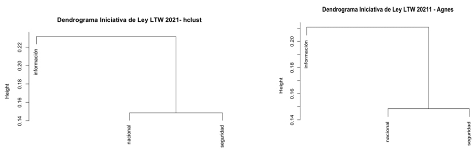 En el análisis de los dendrogramas de hclust y Agnes se encontró que la correlación existente entre los términos de la iniciativa de ley era baja, a razón de que estos solo mostraron un valor de correlación inferior al .20. En este sentido, destaca que en los dos tipos de visualizaciones los términos que se interrelacionaron fueron “información”, con “seguridad” y “nacional”.