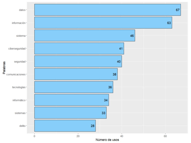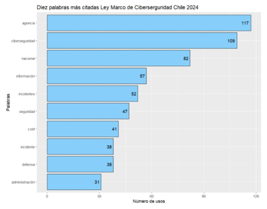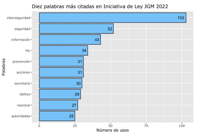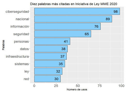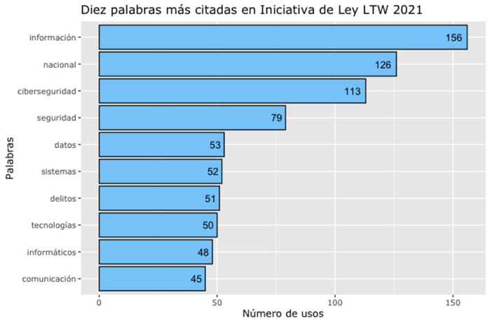 En el análisis de las diez palabras más citadas, la palabra “información” fue la que tuvo un mayor nivel de representación con un total de 156 repeticiones. Estuvo seguida de “nacional” con 126 y “ciberseguridad” con 113. Por otra parte, destaca la incidencia de palabras como “seguridad” (79), “datos” (53), “sistemas” (52), “delitos” (51). Lo que recalca el énfasis en los temas de seguridad pública en la iniciativa de ley. Adicionalmente, destaca la ausencia de términos relacionados con la cooperación internacional, el sector privado o los derechos humanos.