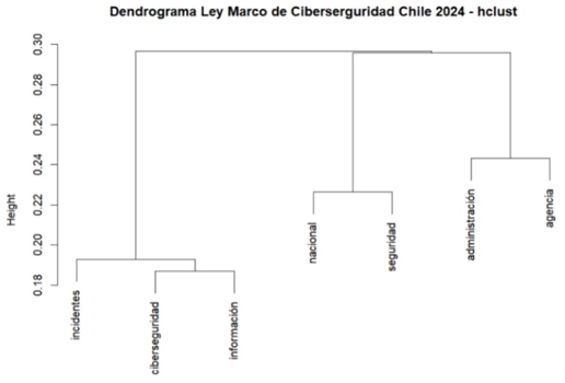 Se presentó que la palabra de “infraestructura” tiene una relación de .40 con palabras como “información” y “servicios”, mientras que estas palabras tienen un grado de correlación del .25 al .30 con palabras como “seguridad”, “ciberseguridad” y “nacional”. Esto indica que los términos se fusionan a un nivel relativamente bajo de disimilitud, lo cual implica que los documentos o elementos dentro de estos clústeres son bastante similares, por lo cual estas palabras son las que presentan un mayor nivel de profundidad en el análisis de la iniciativa.