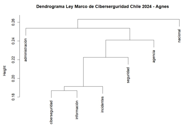 Es importante indicar que la única diferencia sustantiva entre ambos dendrogramas es el nivel de correlación que presentan. En el caso de hclust es más alta hasta alcanzar un rango que va de 0.14 a 0.20, mientras que en Agnes el rango es de 0.145 a 0.175. Sin embargo, los conceptos relacionados a temas de protección de INC, coordinación de actores gubernamentales en la aplicación de la política nacional de ciberseguridad no aparecen en ambas visualizaciones.