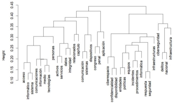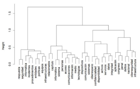 Al analizar los dendrogramas se observa como estos son prácticamente iguales. En ellos se visualiza como dos ramas destacan. La primera une a los conceptos de “ciberseguridad” y “nacional”, mientras que la segunda une a conceptos como “información” y “seguridad”.
