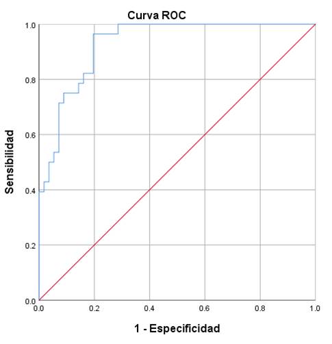 De acuerdo con la curva ROC, con un AUC de 0.930, el mejor punto de corte para considerar la práctica de biopsia utilizando el valor de PHI es de 43 puntos (Figura 1), obteniendo una sensibilidad para la prueba de PHI del 82 % (IC95%: 74-90 %) y especificidad del 84 % (IC95%: 76-92 %); así mismo su valor predictivo positivo fue de 72 % (IC95%: 62-81 %) y su valor predictivo negativo de 90 % (IC95%: 84-96 %).
