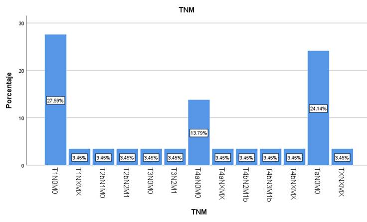 Dentro del motivo de consulta al momento del diagnóstico, el 93.1 % (27) fue por la presencia de hematuria. De acuerdo a la clasificación de TNM se dividen como se muestra en la Gráfica 2. Es importante mencionar que uno de los pacientes no pudo estadificarse de acuerdo a la escala de TNM debido a que perdió seguimiento durante su abordaje diagnóstico.