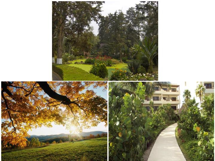 Se utilizaron 14 imágenes de escenarios naturales o construidos con naturaleza obtenidas de un banco de imágenes (Martínez-Soto et al., 2014); por ejemplo, jardines con cuerpos de agua, fuentes, caminos o senderos con vegetación a los lados, paisajes con árboles y pasto, etc. (Figura 1). El valor restaurador de las imágenes ha sido documentado por Martínez-Soto et al. (2014), quienes reportaron puntuaciones de potencial restaurador moderadas (M = 5.48; SD = 2.44) y altas (M = 8.13; DE = 1.81). Como hallazgos en el uso de este banco de ambientes restauradores mediados se encuentran la evocación de sensaciones de placer y activación positiva (Martínez-Soto et al., 2014), y la reducción significativa de estrés y fatiga después de una actividad estresante (Martínez-Soto y González-Santos, 2020).