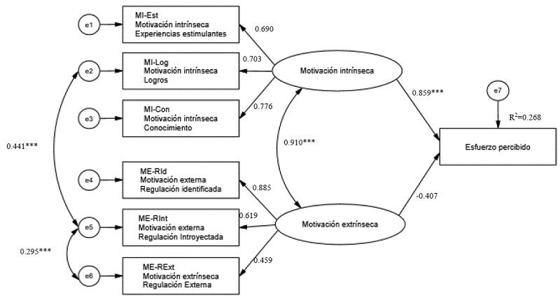 En el modelo estudiado se identificó que la motivación intrínseca guarda una relación directa y estadísticamente significativa con el interés y esfuerzo de los estudiantes, lo cual demuestra que los estudiantes que manifiestan mayor motivación basada en conocimientos, logros y sensaciones, perciben también un mayor interés y esfuerzo en sus estudios.