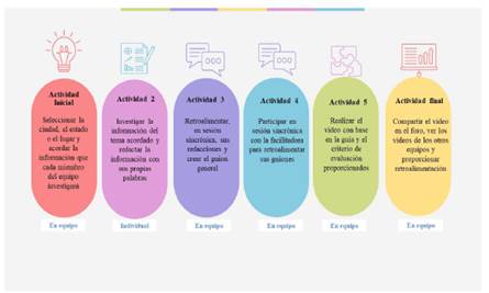 Como parte de las actividades para la realización del proyecto, los estudiantes tendrían tres sesiones sincrónicas, dos en equipo y una grupal. En ellas interactuarían para: