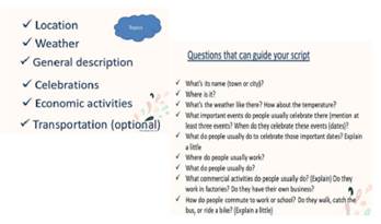 Respecto al proyecto, este consistió en hacer un video sobre una ciudad o estado de la República Mexicana. Los estudiantes debían integrar vocabulario y estructuras lingüísticas de los temas del curso en el guion. Por tal razón, se les proporcionó el listado de los temas que se deberían tomar en cuenta para hacer el proyecto y una serie de preguntas guía (ver la figura 3).