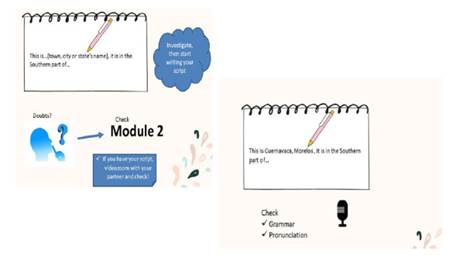 A su vez, las actividades se diseñaron de tal forma que se cumpliera con las características de la metodología del ABP al realizar un trabajo colaborativo, practicar inglés y retroalimentar a sus pares. El facilitador fungiría como guía.