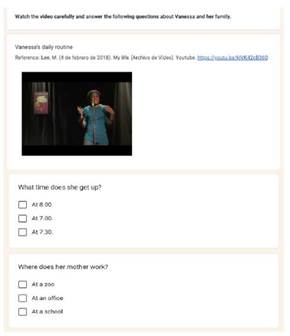 El examen diagnóstico constó de 30 ítems distribuidos en tres secciones. La primera evaluó comprensión lectora; la segunda, expresión escrita; la tercera, comprensión auditiva. Dos secciones fueron de opción múltiple y una de espacio en blanco. La figura 6 muestra un extracto de la sección de este examen.