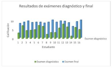 Se debe agregar que varios estudiantes obtuvieron una calificación reprobatoria en el examen diagnóstico; pero su puntuación mejoró en el examen final. La mayoría obtuvo una calificación superior a 8 en la evaluación realizada después de la intervención. Este contraste de resultados permite identificar el progreso de los estudiantes a lo largo del curso.