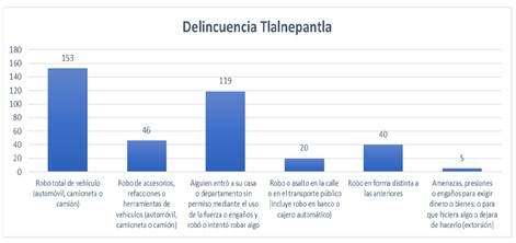 En estos gráficos se puede observar que en las alcaldías Azcapotzalco, Gustavo A. Madero y el municipio de Tlalnepantla el robo principal es de vehículos, seguido de robo en casa o departamento.