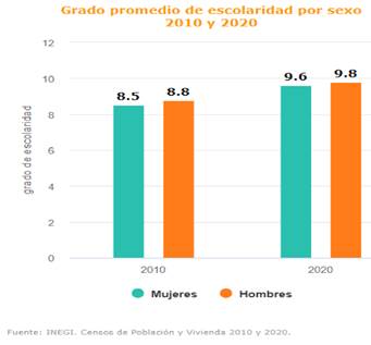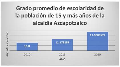 A nivel nacional los hombres tienen un mayor grado de escolaridad con 9.8, las mujeres tienen un grado de escolaridad de 9.6 esto se refleja en un equivalente de segundo de secundaria. A pesar de que en las dos alcaldías y municipio analizado superan el número de años, es muy poca la diferencia y eso se manifiesta en la dinámica social a nivel general y también la vulnerabilidad a la descomposición social. La alcaldía Azcapotzalco está en nivel más alto ya que tiene un grado de escolaridad de 11.90 con un equivalente de segundo de bachillerato; la alcaldía Gustavo A. Madero tiene el segundo lugar, ya que tiene un grado de escolaridad de 11.10 con un equivalente de segundo de bachillerato, el municipio de Tlalnepantla tiene el tercer lugar, ya que tiene un grado de escolaridad de 10.92 un equivalente de primero de bachillerato.
