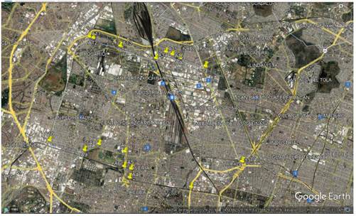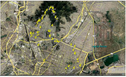 Figura 2 Marcas de posición en el programa Google Earth de la alcaldía Gustavo A. Madero.