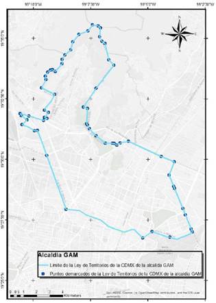 Basándose en la Ley del Territorio en la alcaldía Azcapotzalco y Gustavo A. Madero se detectaron las mojoneras mencionadas, así como las marcas de posición de las intersecciones de avenidas y calles utilizando en el programa de Google Earth. mediante coordenadas X, Y las cuales ayudaron a puntualizar y tener un control específico de los polígonos de las alcaldías (proyección UTM), como se aprecia en las figuras 2 y 3. En la alcaldía GAM se recopilaron 62 marcas de posición y en la Azcapotzalco 17. Es pertinente señalar que estas marcas de posición fueron un referente para generar coordenadas este y coordenadas norte en la Zona 14, que es la zona que corresponde en este estudio.