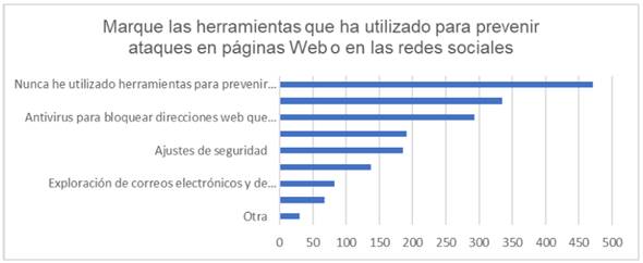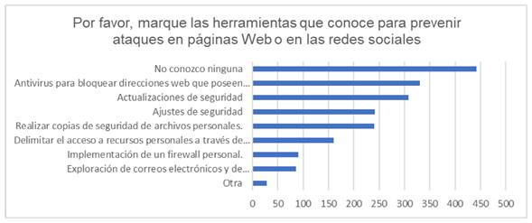 Los resultados muestran una variedad de medidas de seguridad utilizadas por los encuestados, con un énfasis en las actualizaciones de seguridad y el uso de antivirus. Sin embargo, también resalta la necesidad de aumentar la conciencia sobre otras medidas preventivas, como la exploración de correos electrónicos y la delimitación del acceso en dispositivos móviles. Las respuestas obtenidas en la pregunta relacionada a las herramientas utilizadas para prevenir ataques en la Web o en redes sociales, marcan también una alarmante relación en cuanto al por qué se viven ataques de ciberviolencia, como se observa en la Figura 2.