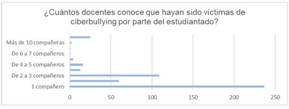 Posteriormente se les pidió que continuaran con la siguiente sección aquellos que conocieran casos de ciberataques a los docentes, continuando 467 (48%), es decir, casi la mitad de los encuestados estaban al tanto de casos de ciberataques. Cuando se les preguntó si conocían a alguien que hubiese sido víctima, los datos mostraron que un pequeño porcentaje de docentes conocen a un número considerable de colegas que han sido víctimas de ciberbullying, incluidos casos de más de 10 compañeros o compañeras resaltando la gravedad del problema como se muestra en la Figura 3.