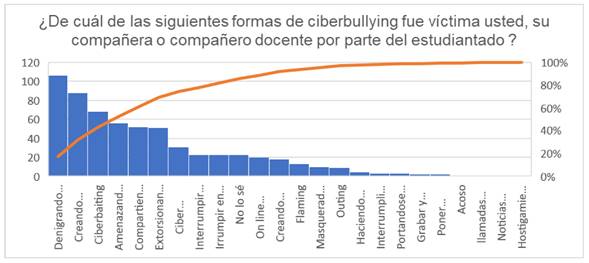 En la pregunta ¿De cuál de las siguientes formas de ciberbullying fue víctima usted, su compañera o compañero docente por parte del estudiantado?, se les pidió que marcaran todas aquellas formas de las cuales, conocían se había llevado a cabo el ciberataque. En la Figura 4 se revela la variedad de formas en que los docentes pueden ser víctimas y resaltan la importancia de abordar adecuadamente este problema y promover un entorno en línea seguro y respetuoso para todos los miembros de la comunidad educativa.
