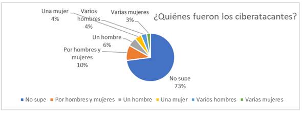 Cuando se interrogó sobre quiénes fueron los ciberatacantes, los datos mostraron una mayoría que no pudo identificarlos claramente. Sin embargo, también se observa que tanto hombres como mujeres, así como individuos solitarios o grupos, pueden estar involucrados en los ciberataques, como se observa en la Figura 5.