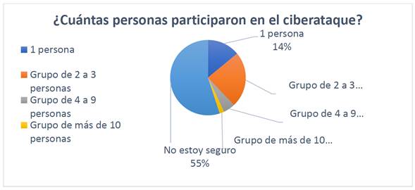 La diversidad de los incidentes de ciberataques a los docentes, es proporcional a la distribución de respuestas, dada la gran variedad en la percepción sobre la naturaleza de los ciberataques; mientras que ciertos perciben los ataques como llevados a cabo por grupos de diversas tallas, otros consideran que fueron perpetrados por individuos solitarios.