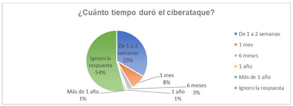 Cuando se cuestionó sobre el tiempo de duración del ciberataque, los hallazgos obtenidos son preocupantes dado que ciertos casos se llegaron a prolongar durante períodos significativos, como se observa en la Figura 7.