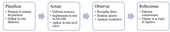 Para lograr el objetivo de este trabajo se siguió la metodología investigación-acción con un enfoque mixto, pues se procuró recolectar y analizar resultados a lo largo de la aplicación del sistema de prácticas para la enseñanza-aprendizaje de los métodos de interpolación y ajuste polinomial. Las etapas de la metodología se muestran en la figura 3.
