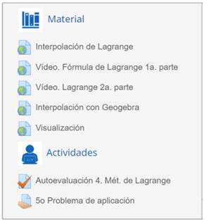 Los recursos y actividades antes descritos se dispusieron en un curso en la plataforma Moodle de la institución (https://sea.acatlan.unam.mx/), dividiendo cada tema en “Material” y “Actividades” como se observa en la Figura 6.