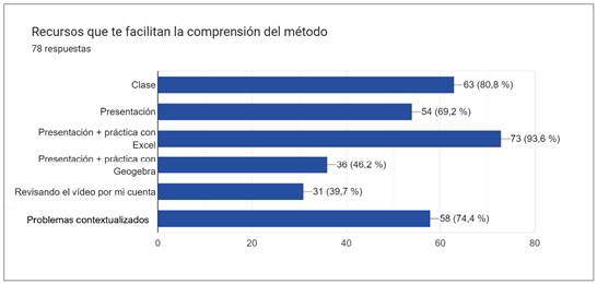 Finalmente, para el análisis cualitativo se aplicó una encuesta para conocer la opinión de los estudiantes, la cual fue respondida por 78 de ellos, de los cuales el 74 % consideró que los problemas contextualizados facilitaron la comprensión del método (figura 8) y fueron el componente de la ruta que más contribuyó a su aprendizaje (figura 9).