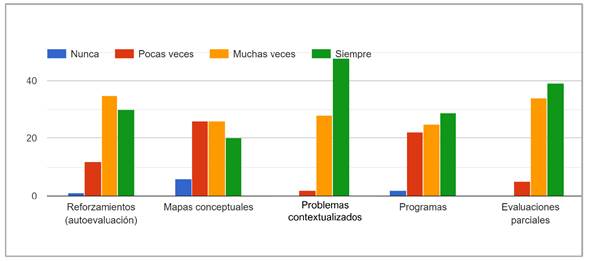Ante ambos cuestionamientos, se observa que los estudiantes tienen preferencia por las sesiones de clase y por las actividades que requieren su participación activa, como los problemas, las evaluaciones parciales y las actividades de autoevaluación. Esto se confirma con su opinión sobre los mapas conceptuales, que a pesar de tener como propósito integrar y reafirmar conocimientos para prepararlos para la evaluación, los estudiantes no lo percibieron como una actividad importante para su aprendizaje (figura 9).