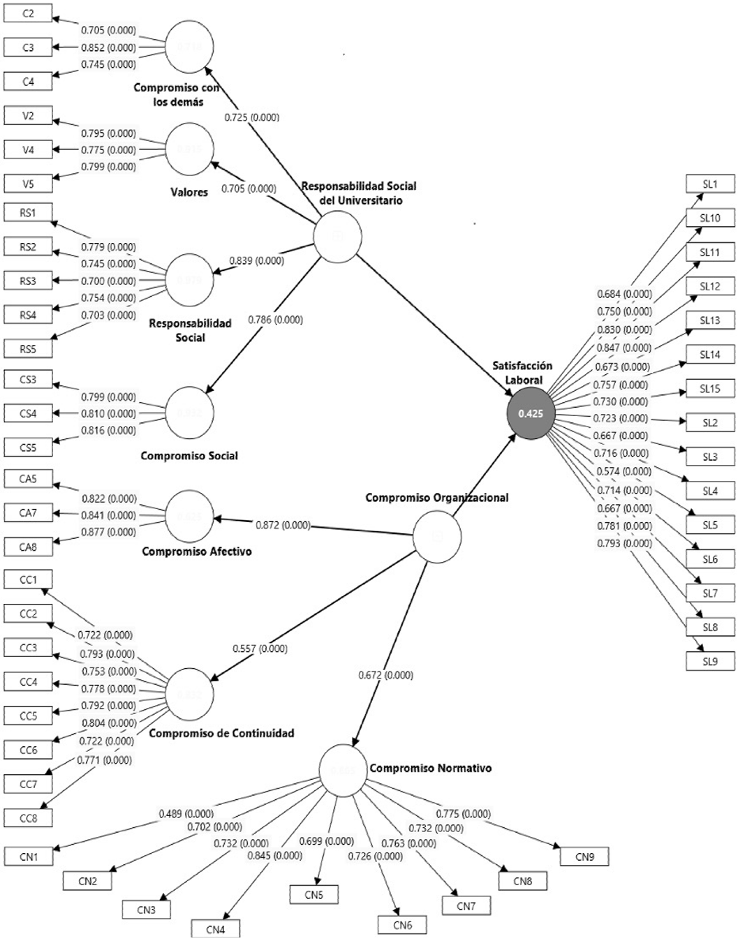 El método de análisis se desarrolló a partir de un estudio cuantitativo, transversal, exploratorio y no experimental, con el propósito de desarrollar y validar una escala para evaluar la responsabilidad social del universitario (RSU), el compromiso organizacional (CO) y la satisfacción laboral (SL). El modelo propuesto se estructuró en segundo orden para las variables independientes (responsabilidad social del universitario y compromiso organizacional), y en primer orden para la variable dependiente (satisfacción laboral), todos reflectivos. Un modelo reflectivo se caracteriza porque los indicadores son las distintas manifestaciones o representaciones de la variable latente que se pretende medir, es decir, el efecto de causalidad fluye desde el constructo hacia sus indicadores, y la modificación o eliminación de alguna de las medidas no altera la naturaleza de la variable (Armas, 2022).
