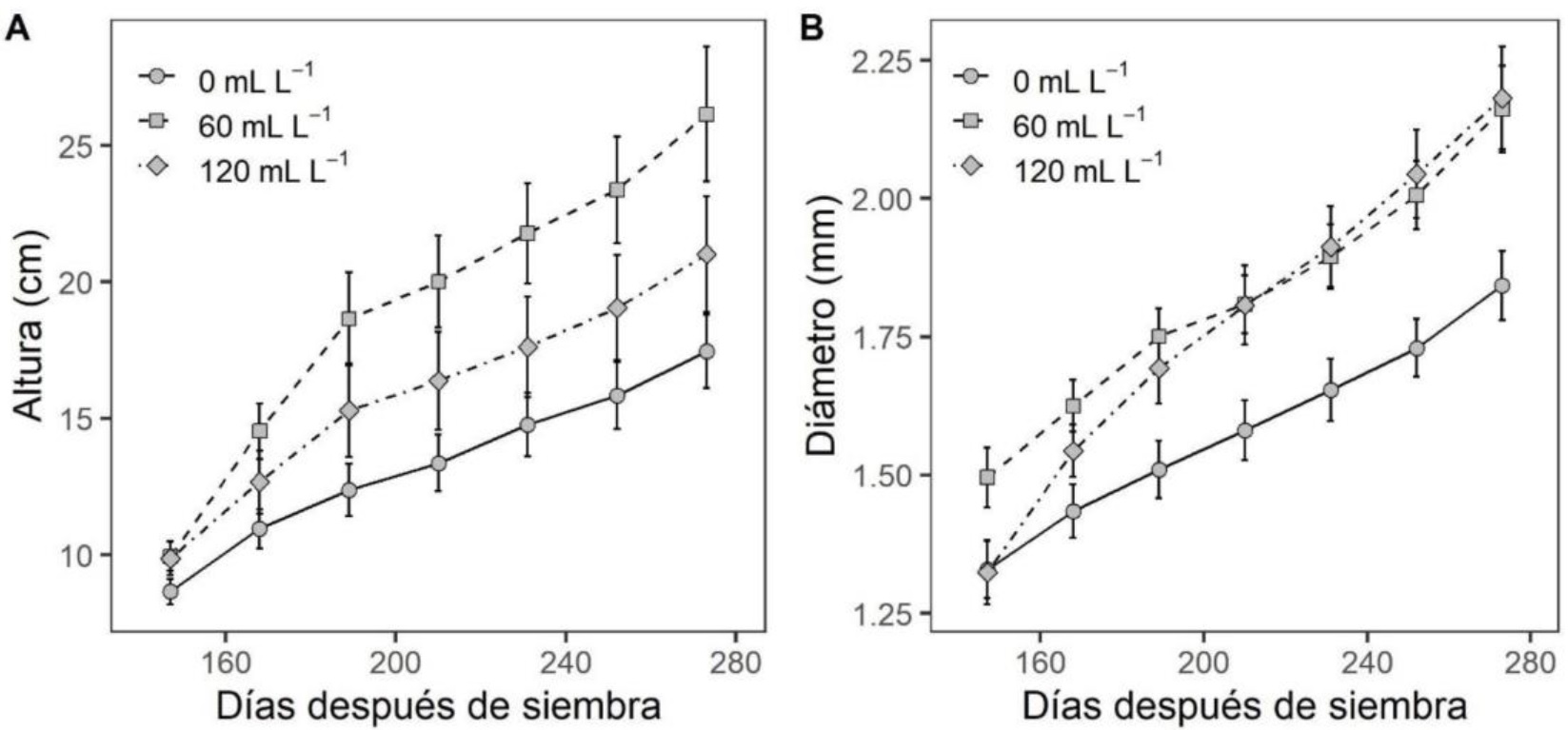 Figura 1 Crecimiento en altura (A) y diámetro (B) en plantas de mezquite (Prosopis laevigata) sometidas a diferentes dosis de aplicación de enmiendas húmicas. Los puntos representan valores promedio e intervalos de confianza al 95% (n = 48). Las diferencias entre tratamientos pueden inferirse si los intervalos de confianza no se superponen.