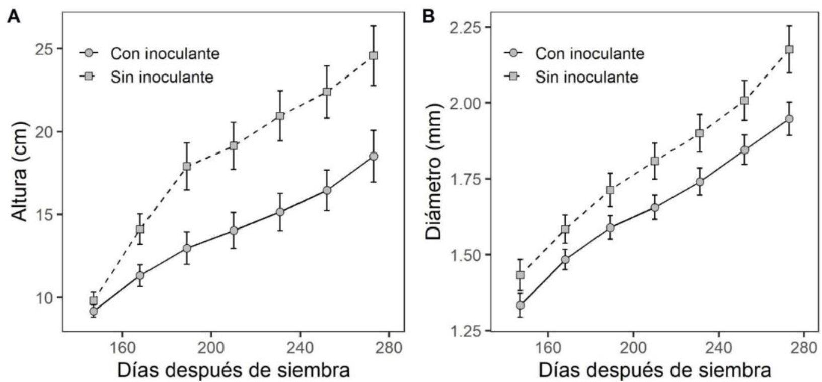 Por otra parte, se encontró menor crecimiento, tanto en altura y diámetro, en plantas que se inocularon con A. brasilense durante los cuatro meses evaluados. En altura, las diferencias entre las plantas inoculadas y no inoculadas ocurrieron a partir del día 168 después de siembra (interacción significativa DDS×inoculante, p < 0.001; Figura 2A). Por el contrario, las diferencias en diámetro fueron significativas en todo el periodo de evaluación (p < 0.001, Figura 2B).