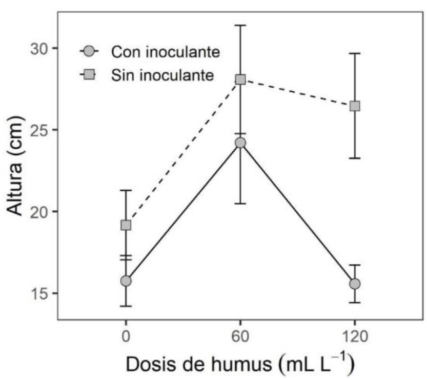 En la última medición, al final del estudio, se encontró una interacción significativa humus×inoculante en la altura de la planta (p = 0.023), pero no así en diámetro. Dicha interacción indicó que el efecto de la inoculación fue significativo sólo en la dosis alta de humus. Es decir, en la dosis de 120 mL L-1 de humus, las plantas inoculadas con A. brasilense tuvieron menor altura que las no inoculadas. Por el contrario, en los niveles bajos de humus, las diferencias entre inocular y no inocular no fueron significativas (Figura 3).