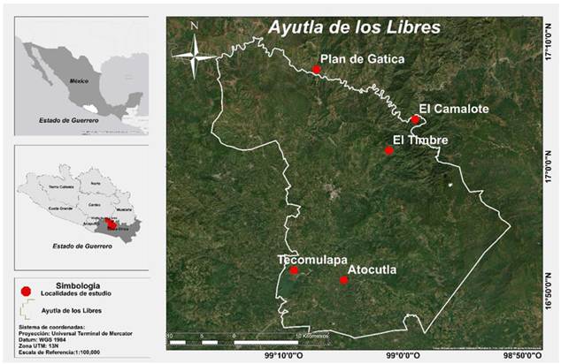 El estudio se realizó en la región Costa Chica del estado de Guerrero, en cinco comunidades del municipio de Ayutla de los Libres (Atocutla, El Camalote, El Timbre, Plan de Gatica, Tecomulapa), participantes de manera voluntaria (Figura 1). El municipio posee una superficie de 1 030 km2. Aproximadamente, 40% de la población del municipio puede considerarse indígena, en la que predomina la lengua mixteca y tlapaneca (INEGI 2020). El clima predominante es cálido subhúmedo con lluvias en verano, con temperatura media anual de 28 °C; las lluvias se presentan de junio a octubre, con mayor intensidad en septiembre, la precipitación oscila entre 1 500 y 2 000 mm (INEGI 2021).