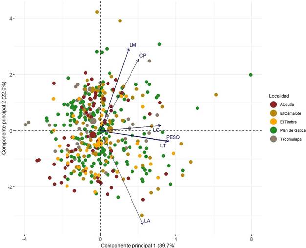 La influencia de la localidad sobre las variables morfométricas evaluadas se resume en la Tabla 2. Excepto para CP, todas las variables evaluadas fueron significativamente (p < 0.05) afectadas por el sitio de origen. Las aves de “El Camalote” presentaron los valores más altos de PV, LC, CP y LT, mientras que las mayores medidas de LA y LM se observaron en “El Timbre” y “Tecomulapa”, respectivamente. El factor de la localidad explicó hasta 17.6% de la variabilidad observada.