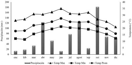 El material vegetal utilizado fue el pasto Toledo (Urochloa brizantha CIAT 26110) el cual se estableció en el mes de noviembre de 2022 en una superficie de 530 m2, en la cual se delimitaron parcelas de 5 × 5 m. La siembra se realizó con semilla botánica a chorrillo con una distancia entre hileras de 50 cm y 1 m entre callejones. Antes de iniciar los muestreos en marzo de 2023, se realizó un corte de uniformización a 10 cm de altura a fin de tener una homogeneidad. El control de arvenses fue de manera manual. La precipitación mensual, humedad relativa y las temperaturas medias, máximas y mínimas durante el período de evaluación se reportan en la Figura 1.