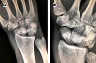 Figura 1: Radiografías (A) anteroposterior y (B) oblicua de muñeca derecha. Se demuestra pérdida de las líneas de Gilula y fractura en escafoides.