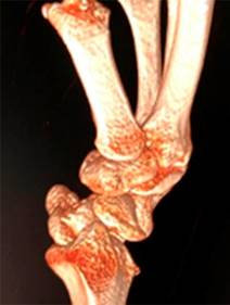 Figura 2: Reconstrucción 3D de tomografía axial computarizada. Se observa fractura-luxación transescafo-perilunar.