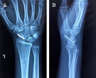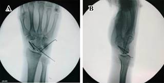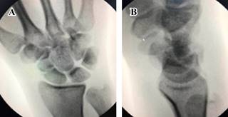 Figura 3: Imagen fluoroscópica (A) anteroposterior y (B) lateral de muñeca, en la cual se muestra adecuada reducción de luxación de los huesos del carpo.