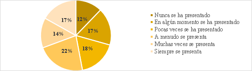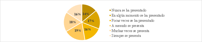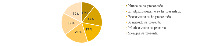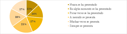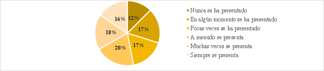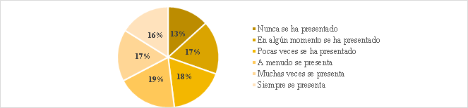 En lo concerniente a la figura 6, en la que se cuestiona al colaborador si en la empresa se suscita la insatisfacción laboral, el 19% que corresponde a 31 personas indicaron que esta problemática se presenta a menudo en las organizaciones donde se desempeñan, así como, el 18% equivalente a 29 personas encuestadas, señalaron que este inconveniente se ha presentado muchas veces en la organización. No obstante, el 14% equivalente a 22 encuestados, manifiestan que nunca se ha presentado la insatisfacción laboral, lo cual refleja una alta motivación para el cumplimiento de las funciones y tareas asignadas. De este modo, la insatisfacción laboral se percibe como una problemática muy frecuente percibida por los colaboradores encuestados, el cual incide en la actitud para el trabajo y el manejo de los conflictos y las relaciones interpersonales, no solamente entre compañeros de trabajo, sino también, entre jefes y directivos con los colaboradores.