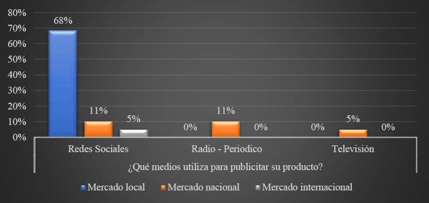 De acuerdo con las encuestas realizadas, se logró determinar que los caficultores productores de cafés especiales publicitan sus productos en los siguientes medios: en redes sociales corresponde a un 84%. Es este medio el de mayor difusión del producto teniendo en cuenta que en la mayoría de dichas redes sociales, se pueden generar páginas y grupos de forma gratuita, aspecto que favorece a los productores en términos de optimización de costos. Por otra parte, el 11% de los caficultores publicitan el café especial por medio de medios digitales, mientras que solo el 5%, hace la publicidad del producto en televisión, lo que claramente evidencia que no todos los productores cuentan con los recursos necesarios para la adquisición de un espacio televisivo para publicitar los cafés especiales, siendo por lo general, las empresas de gran escala de comercialización de café las que acuden a este medio.