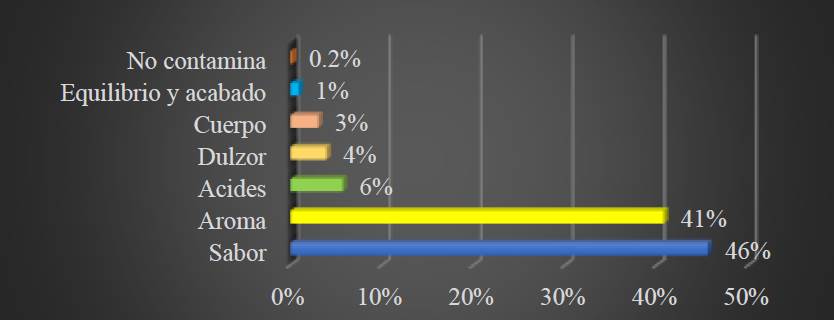 Se identifican siete aspectos diferenciadores del café especial al café tradicional acorde a las encuetas realizadas, en donde predominan en primer lugar con el 46% se indicó que el factor diferenciador radico en destacar su sabor, en segundo lugar con el 41%, los caficultores afirman que el aroma es un factor diferenciador principal, posteriormente y en menor porcentaje con el 6% destacando la acides, con el 4% el dulzor, con el 3% el cuerpo, el 1% con el equilibrio y finalmente con tan solo el 0.2% destaca que es amigable con el medio ambiente.