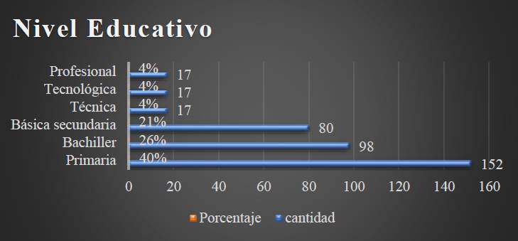 La Figura 4 determina que el 40% de los encuestados tienen educación primaria, el 26% son bachilleres, el 21% cuentan con educación básica secundaria, el 4% poseen formación técnica, otro 4% tienen educación tecnológica y el restante 4% son profesionales.