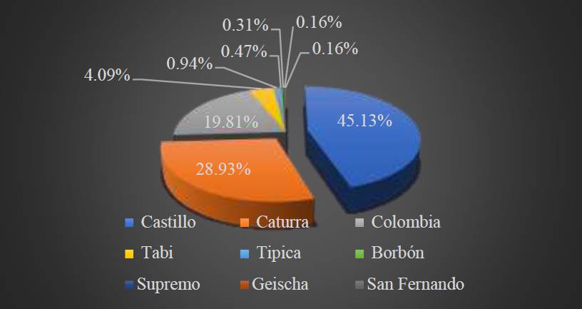 Se identificó que dentro de las variedades de café que más se cultiva en la región objeto de análisis, están la variedad castillo, le sigue la variedad caturra, de igual manera se tiene el café de variedad Colombia y, finalmente, la variedad Tabí concentrando estas cuatro variedades de café representan el 97,96 % de los cafés cultivados en la zona, los otros tipos de café que se cultivan en la región tal como la típica, borbón, supremo, geisha y san Fernando, su porcentaje de participación es muy baja o poco representativa.