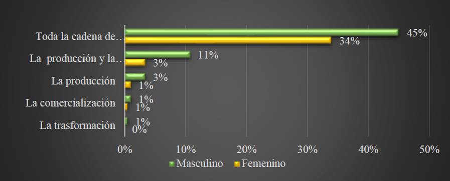 De igual forma, en lo concerniente al proceso de transformación el 1% corresponde a hombres, y, por el contrario, en este proceso de transformación no hay participación de mujeres. Por último, se logra identificar los que están enfocados solo en la comercialización el cual solo representa participación de hombres con tan solo el 1% y no se cuenta con participación de las mujeres en el proceso de comercialización.