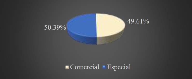 De esta forma, con relación al café con la variedad Típica el tipo de café comercial representa el 1.90%, mientras en tipo de café especial no se produce y representa un 0% para esta variedad. En lo referente al café con la variedad Borbón, el 0.63% corresponde al tipo de café comercial, mientras el 0.31% corresponde al café de tipo especial.
